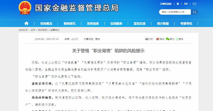 "content": "<p style=\"text-align: center; line-height: 3;\">关于警惕“职业背债”陷阱的风险提示</p>\r\n<p style=\"text-align: left; line-height: 3;\"><br />近期,社会上出现以“快速致富”“<strong>无需偿还债务</strong>”为诱饵的“<strong>职业背债”</strong>骗局,部分消费者因轻信此类虚假宣传陷入困境。金融监管总局金融消费者权益保护局提示广大消费者提高警惕,远离“职业背债”陷阱。</p>\r\n<hr />\r\n<p style=\"line-height: 3;\"><strong>“职业背债”陷阱主要有以下套路:</strong></p>\r\n<p style=\"line-height: 3;\"><strong>虚假宣传引诱。</strong>以“<strong>无需还款即可获得高额回报”“只需贡献自己征信”“短时间轻松获得高额酬劳”“不用本人偿还债务</strong>”等话术为诱饵,吸引目标人群。</p>\r\n<p style=\"line-height: 3;\"><strong>伪造材料骗贷。</strong>制作虚假职业证明、收入证明、银行流水等资料,将不符合银行贷款条件的人包装成“优质客户”,骗取银行贷款。</p>\r\n<p style=\"line-height: 3;\"><strong>抽取高额分成。</strong>获取银行贷款后,不法分子抽取高额分成,将相关债务和风险全部转嫁给背债人承担。</p>\r\n<p style=\"line-height: 3;\"><img class=\"wscnph\" src=\"https://oaservice.xiedaiwang.com/media/融资顾问CFC-亚投宏远2025-07-22 17:43:4451.png\" /></p>\r\n<hr />\r\n<p style=\"line-height: 3;\">一旦成为“职业背债人”,将面临诸多风险隐患:</p>\r\n<p style=\"line-height: 3;\"><strong>一是承担高额债务。</strong>背债人作为借款人,需依法偿还全部本金及利息,逾期未偿还将面临催收、罚息,甚至被起诉。从实际案例看,背债人到手的“背债费”只是贷款金额的一部分,大量资金被不良中介和不法人员瓜分,而背债人却要背负远超自身所得的债务。</p>\r\n<p style=\"line-height: 3;\"><strong>二是个人信用受损。</strong>一旦背债人无力偿还贷款,个人征信将留下不良记录,影响未来获取正规金融服务,甚至成为失信被执行人,出行、就业等正常生活将受到限制。</p>\r\n<p style=\"line-height: 3;\"><strong>三是法律风险极高。</strong>协助伪造资料骗取金融机构资金的行为,可能涉嫌诈骗、非法集资、骗取贷款、洗钱等刑事犯罪,沦为不法分子的共犯,面临被追究法律责任的风险。</p>\r\n<hr />\r\n<p style=\"line-height: 3;\">为保护金融消费者合法权益,在此提示:</p>\r\n<p style=\"line-height: 3;\"><strong>一是提高风险意识</strong>。切记任何承诺以个人名义贷款,却声称“不用你还”的话术,本质都是骗局。面对“职业背债”这类看似轻松赚钱的“好事”,一定要保持清醒,不要铤而走险,贪小失大。</p>\r\n<p style=\"line-height: 3;\"><strong>二是珍惜个人信用。</strong>信用记录是个人经济社会生活中的第二张“身份证”,要合理规划收支,按时偿还各类债务,不随意为他人担保,不参与任何形式的骗贷或信用卡套现。发现信用记录异常,及时联系金融机构核实处理。</p>\r\n<p style=\"line-height: 3;\"><strong>三是审慎对待“代办”业务</strong>。在面临资金需求时,警惕非法中介虚假宣传,务必选择正规、可靠的渠道办理业务。妥善保管个人信息,不轻易将个人证件原件交由他人“代办”业务,避免上当受骗遭受损失。在任何合同上签字前,务必仔细阅读条款,明确自身权利义务。</p>\r\n<p style=\"line-height: 3;\"><strong>四是遇到可疑情况及时求助举报。</strong>目前,公安部和金融监管总局正在联合开展金融领域“黑灰产”违法犯罪集群打击工作,依法严打骗取贷款、贷款诈骗等犯罪活动。如公众发现有人兜售“背债赚钱”门路,或身边有类似伪造材料、骗取贷款行为的,一定要坚决拒绝,并及时向金融监管等有关部门举报或向公安机关报案。一旦不慎卷入骗局,要第一时间收集证据,寻求法律帮助,最大程度减少损失。</p>",