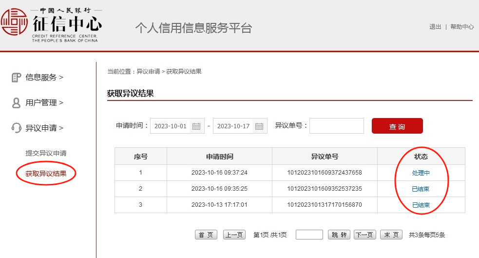 "content": "<p id=\"contenttitle\" style=\"text-align: center; line-height: 3;\"><strong><span style=\"font-size: 14pt;\">异议申请线上办理</span><span style=\"font-size: 14pt;\"> 征信服务便捷体验</span></strong></p>\r\n<div>\r\n<div id=\"zoom\">\r\n<p style=\"line-height: 3;\"><span style=\"font-size: 14pt;\">为深入践行征信为民理念,满足社会公众个人征信异议的线上申请需求,中国人民银行征信中心(以下简称征信中心)的互联网个人信用信息服务平台(以下简称互联网平台,网址:https://ipcrs.pbccrc.org.cn)已正式面向社会公众提供个人征信异议申请服务。</span><span style=\"font-size: 14pt;\"> </span></p>\r\n<p style=\"line-height: 3;\"><span style=\"font-size: 14pt;\">征信中心通过实现异议申请线上办理,进一步强化了征信服务供给,有效提升了社会公众异议申请的便利度,为社会公众维护自身合法权益提供了便捷的服务渠道。</span></p>\r\n<p style=\"line-height: 3;\" align=\"center\"><strong><span style=\"font-size: 14pt;\">互联网平台异议申请指引</span></strong></p>\r\n<p style=\"line-height: 3;\"><strong><span style=\"font-size: 14pt;\">一、用户登录互联网平台后,点击“提交异议申请”,在完成“阅读并同意异议申请服务协议”、“身份验证”、“阅读并同意授权书”和“填写基本信息”环节后,即可进入“异议事项信息填写”环节。<img class=\"wscnph\" src=\"https://oaservice.xiedaiwang.com/media/融资顾问CFC-亚投宏远2025-06-29 14:35:3644.png\" /></span></strong></p>\r\n<div>\r\n<div id=\"zoom\">\r\n<p style=\"line-height: 3;\"><strong><span style=\"font-size: 14pt;\">二、异议事项的信息类型包括“个人基本信息”、“信贷交易信息明细”、“非信贷交易信息明细”、“公共信息明细”和“查询记录”五部分。</span></strong></p>\r\n<p style=\"line-height: 3;\"><span style=\"font-size: 14pt;\">用户可根据近期通过人民银行临柜,人民银行或商业银行布设的自助查询机查得的《个人信用报告(本人版)》所展示的内容填写相关信息。</span></p>\r\n<p style=\"line-height: 3;\"><span style=\"font-size: 14pt;\">如在异议申请填写过程中需要帮助,用户可参考《异议申请填写指引》准确填写异议申请资料或拨打征信中心客服电话4008108866进行咨询。 <img class=\"wscnph\" src=\"https://oaservice.xiedaiwang.com/media/融资顾问CFC-亚投宏远2025-06-29 14:35:4748.png\" /></span></p>\r\n<p id=\"zoom\" style=\"line-height: 3;\"><strong><span style=\"font-size: 14pt;\">三、在填写相关资料后,用户可点击“获取异议结果”查询异议状态。异议状态包括“审核中”、“审核未通过”、“处理中”和“已结束”四种情况。</span></strong></p>\r\n<p style=\"line-height: 3;\"><span style=\"font-size: 14pt;\">如状态显示为“审核中”,表示异议申请资料已提交审核中,用户可耐心等待审核结果。</span></p>\r\n<p style=\"line-height: 3;\"><span style=\"font-size: 14pt;\">如状态显示为“审核未通过”,表示异议申请资料未通过审核,用户会收到审核未通过的短信通知。</span></p>\r\n<p style=\"line-height: 3;\"><span style=\"font-size: 14pt;\">如状态显示为“处理中”,表示异议申请资料已接收并正在核查处理中,用户可等待后续处理结果。</span></p>\r\n<p style=\"line-height: 3;\"><span style=\"font-size: 14pt;\">如状态显示为“已结束”,表示异议已处理完毕,用户可以打开异议回复函查看异议处理结果。若异议信息得到更正,用户可下载更正后的《个人信用报告(本人版)》。</span></p>\r\n<p style=\"line-height: 3;\"><strong><span style=\"font-size: 14pt;\">四、互联网平台异议申请详细操作流程也可通过“操作手册”进行了解。</span></strong><span style=\"font-size: 14pt;\"><br /></span></p>\r\n</div>\r\n</div>\r\n</div>\r\n</div>",