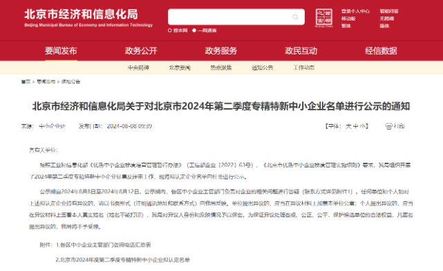 "describe": "北京市经济和信息化局关于对北京市2024年第二季度专精特新中小企业名单进行公示的通知",